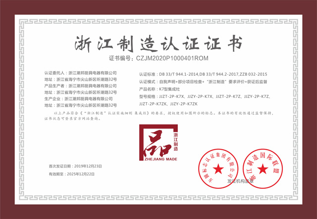 潮邦集成灶榮獲 “浙江制造”品字標認證