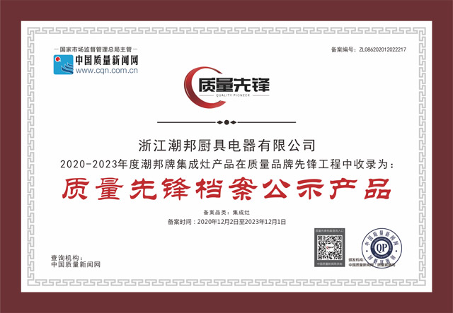 潮邦牌集成灶產品在質量品牌先鋒工程中收錄為質量先鋒檔案公示產品
