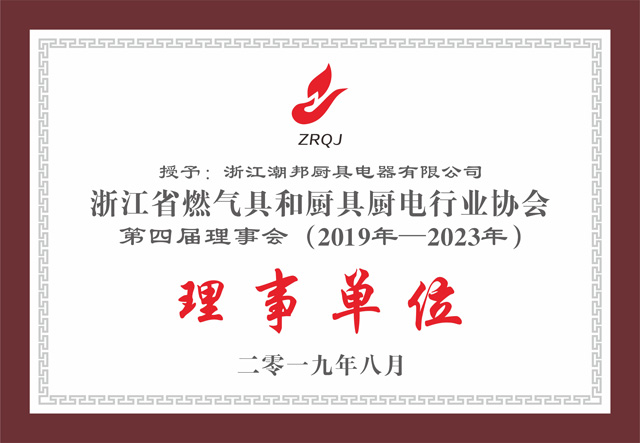 潮邦集成灶當選“浙江省燃氣具和廚具廚電行業協會第四屆理事會理事單位”