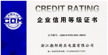 近日,全國綜合信用評估中心為浙江潮邦廚具電器有限公司頒發了企業信用評價AAA級信用企業證書,從誠信經營、質量服務信譽、資信等級