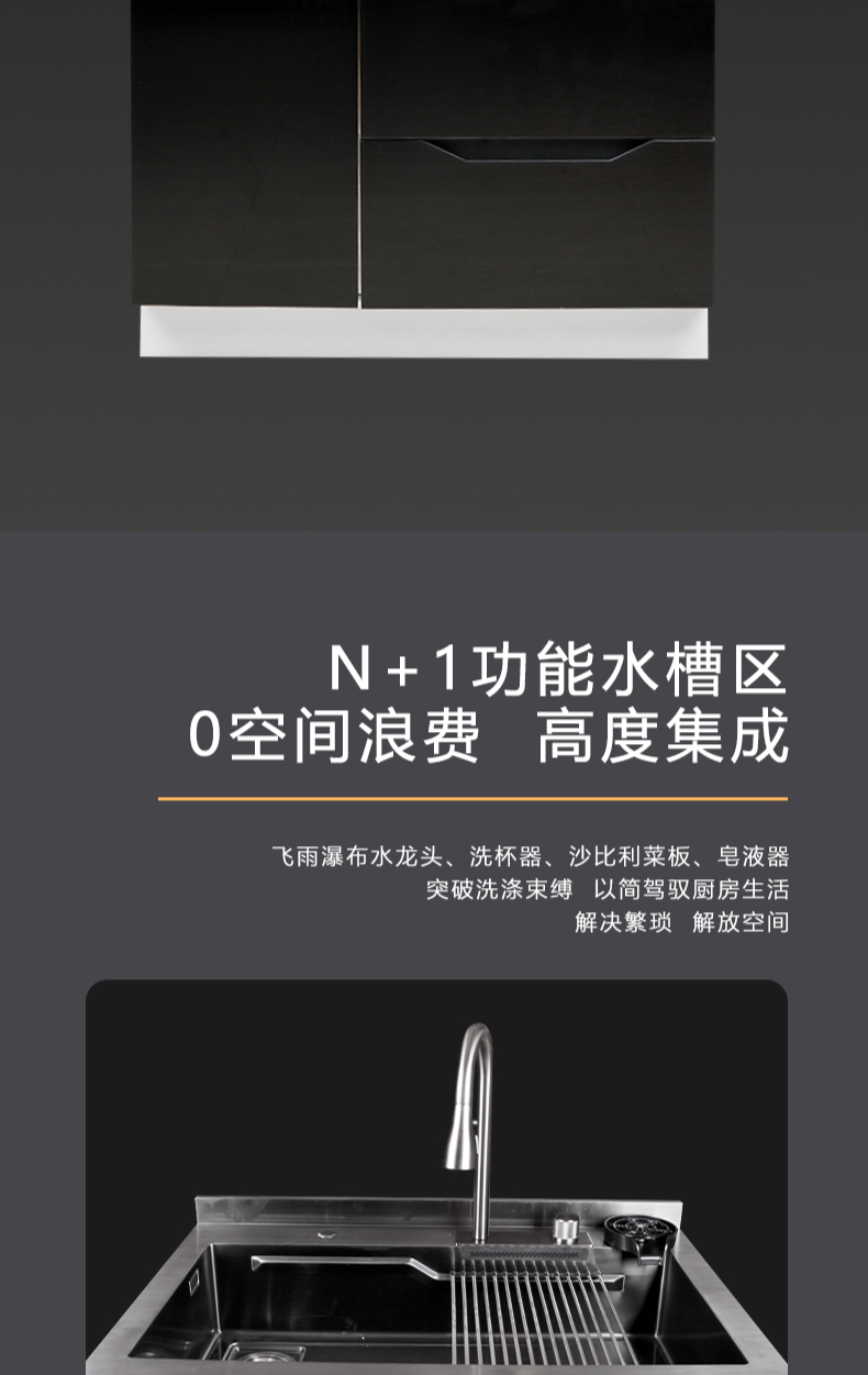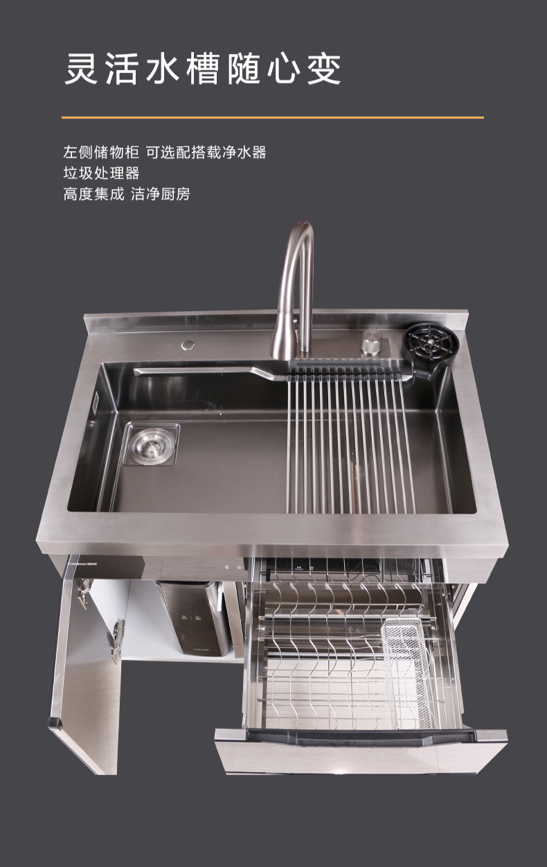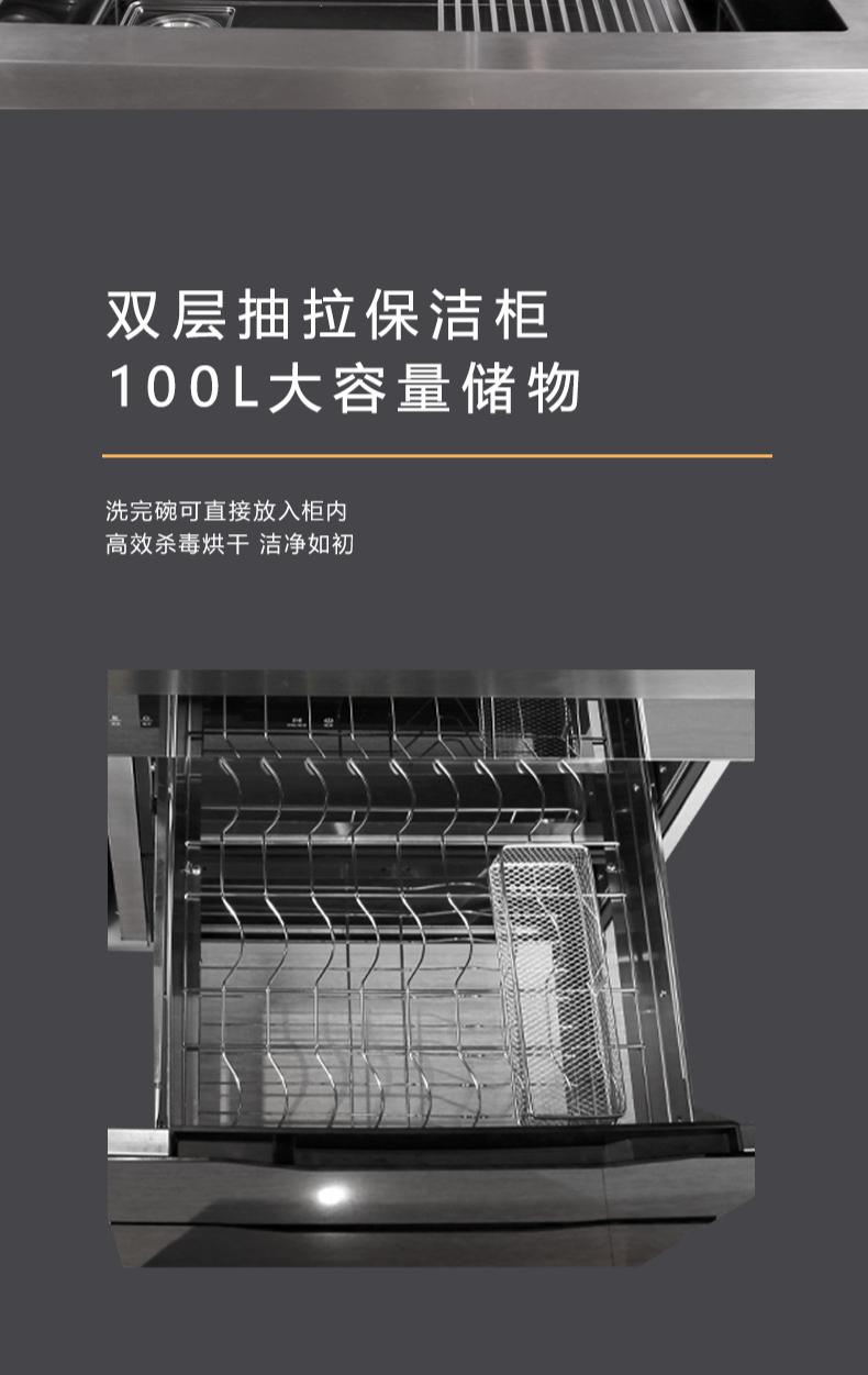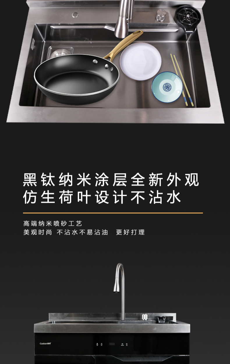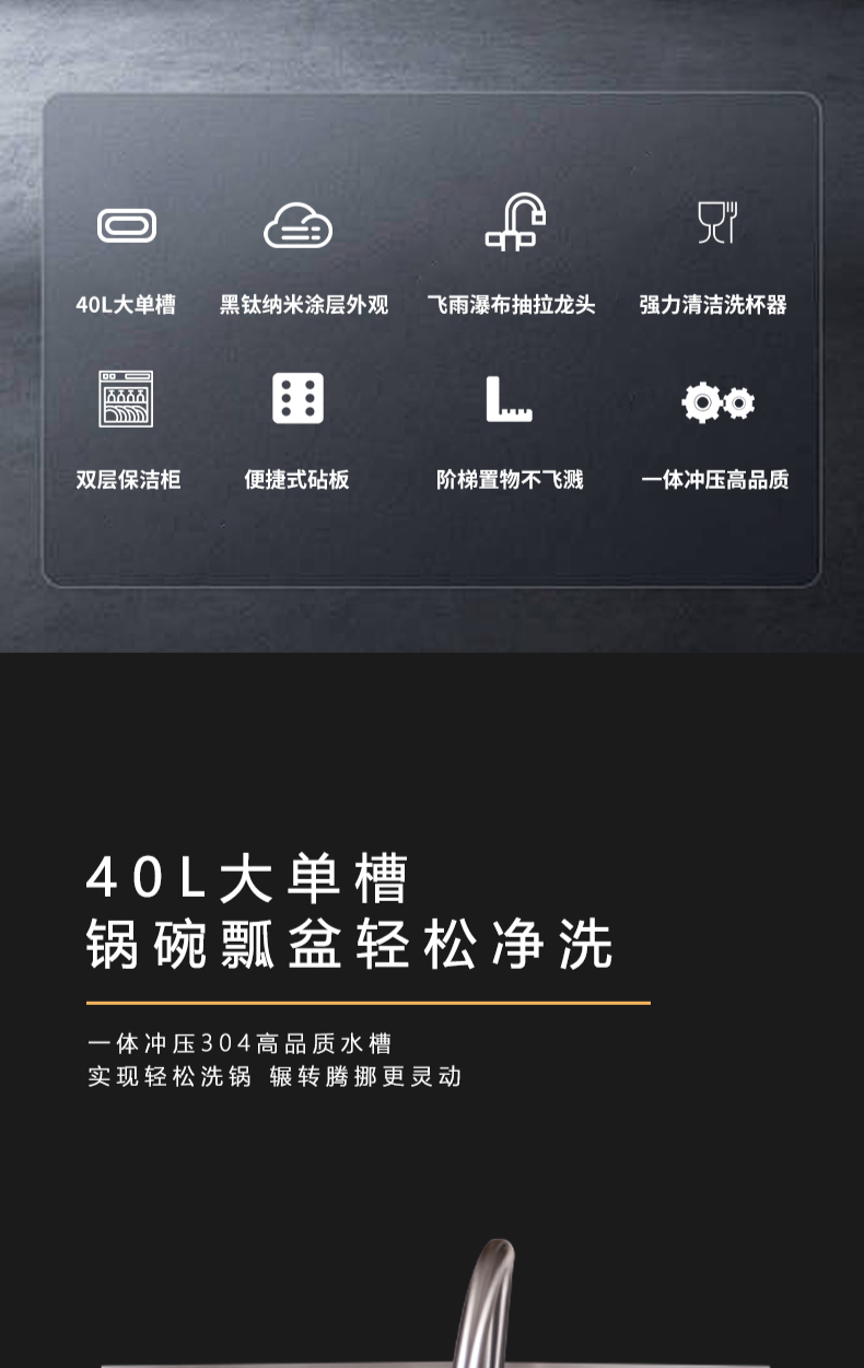 40L大單槽,黑鈦納米涂層,強力清潔洗杯器,雙層保潔柜,階梯置物不飛濺,一體沖壓