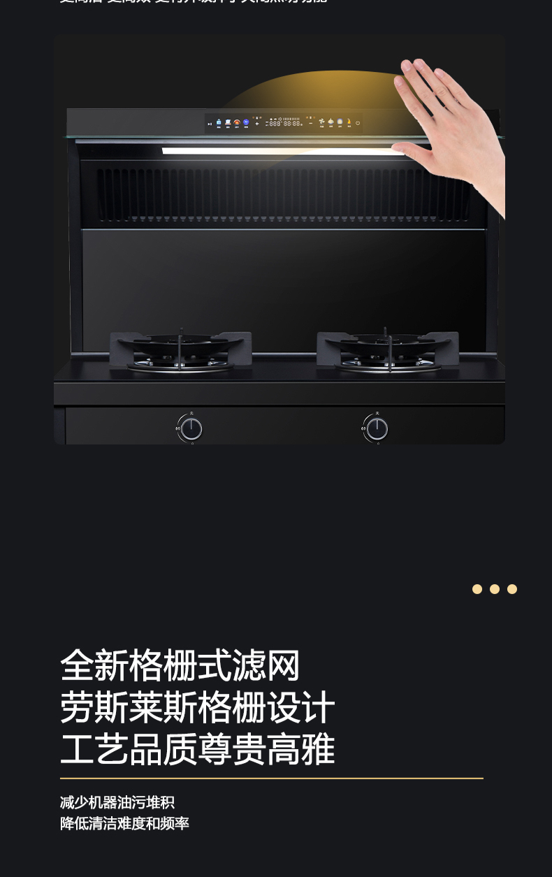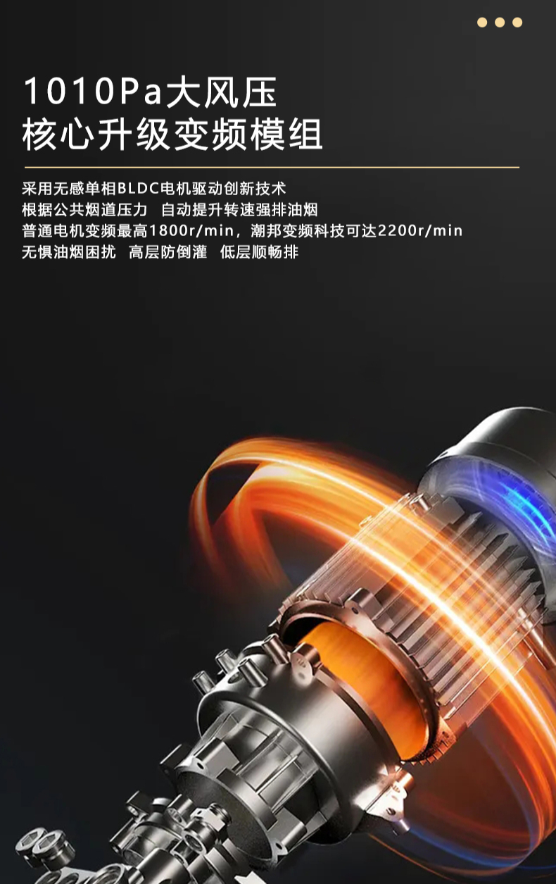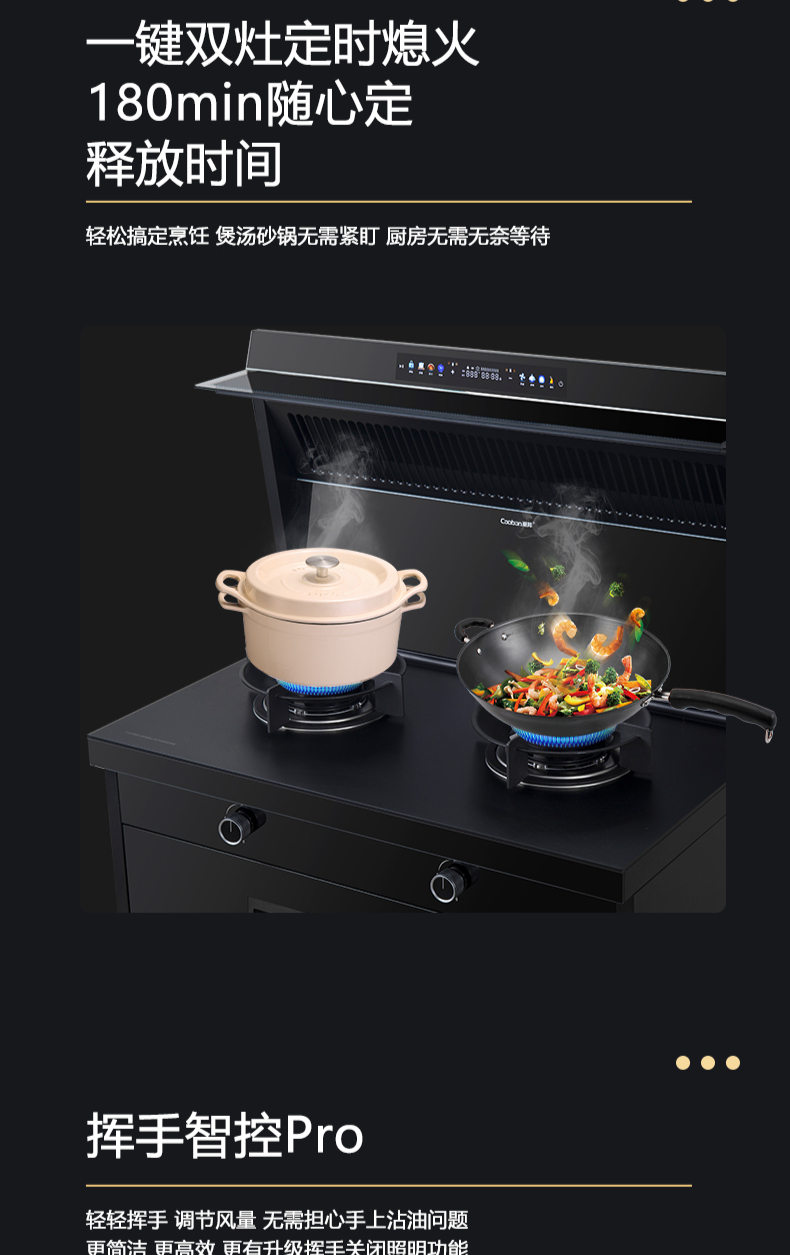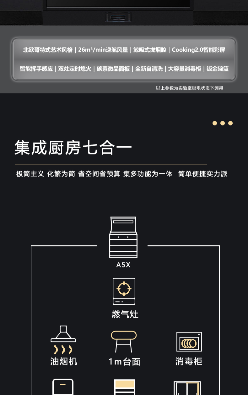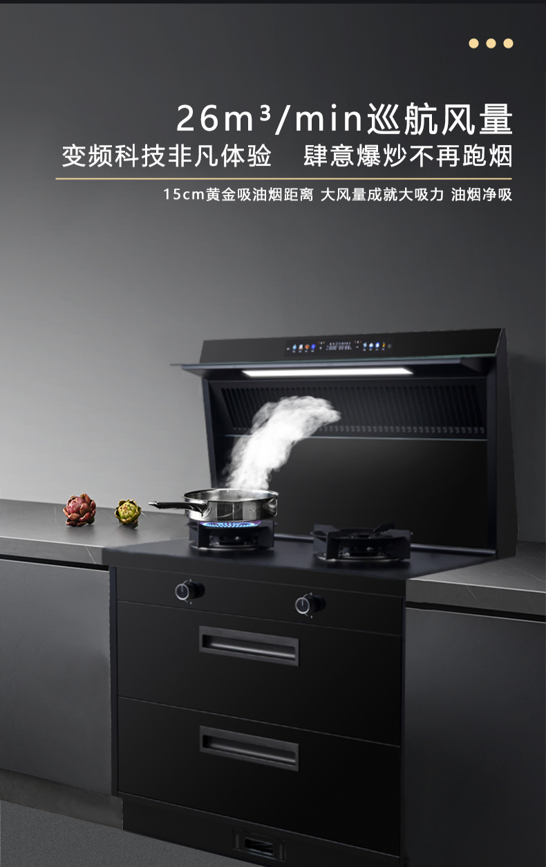 廚房七合一,26方超大巡航風(fēng)量,雙核驅(qū)動變頻控制,5kW大火力,揮手智控,電熱自清潔