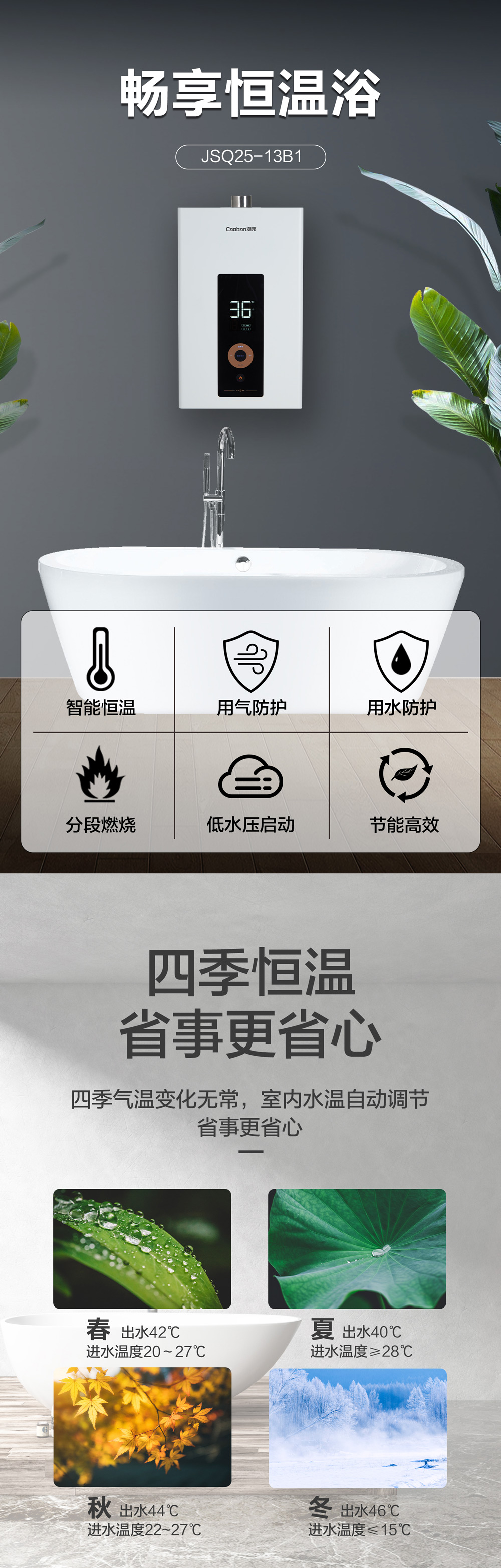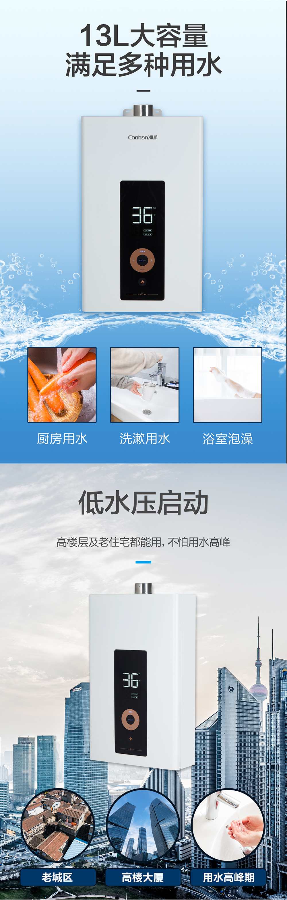 智能恒溫,用氣用水防護,低水壓啟動。